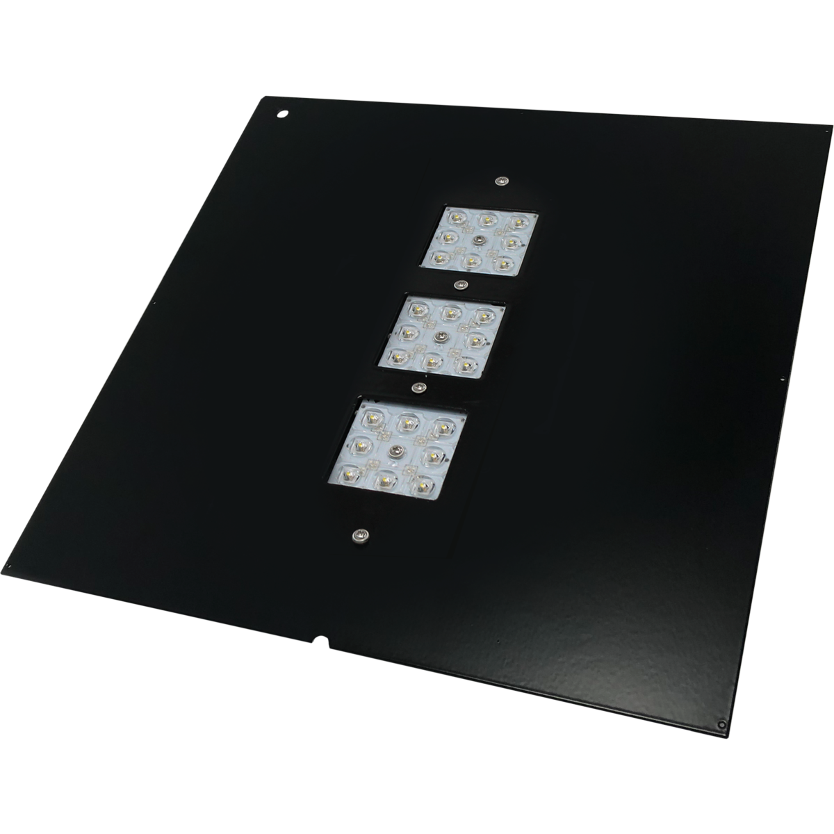 Le Bloc Optique LED Haute Efficacité 48w 8640 lumens est équipé de 24 Leds SMD3535 L90B10 pour une efficacité lumineuse nominale supérieure à 166lm/w. Son système d'optique de base  est symétrique avec un faisceau à 150°. La Platine se compose d'une plaque d'acier peinte au four de dimension standard 385x385mm. Les optiques sont en verre trempé de 4mm avec un facteur de résistance IK08.