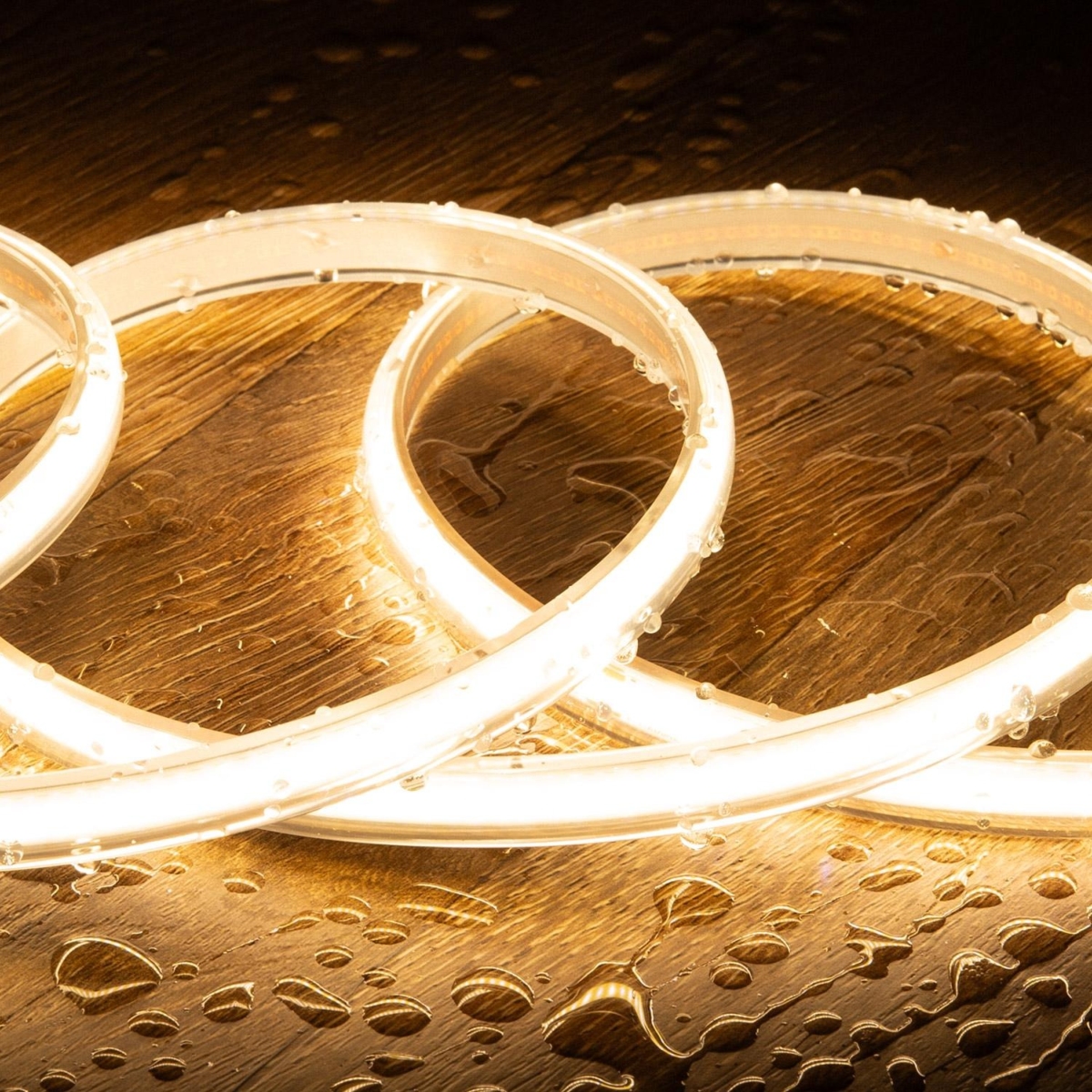 La Bobine de Ruban Led COB Dimmable 220V est composée de 320 LED par mètre qui consomment seulement 8W/m, avec un rendement lumineux de 720 lumens par mètres. le ruban est fabriqué avec des matériaux de grande qualité et dispose d'une protection IP65 qui le rend parfaitement étanche à l'eau et à la poussière, pour une utilisation à l'intérieur et à l'extérieur. Elle intègre des Leds SMD2835 haute performance pour une luminosité intense sur un angle de 120°.