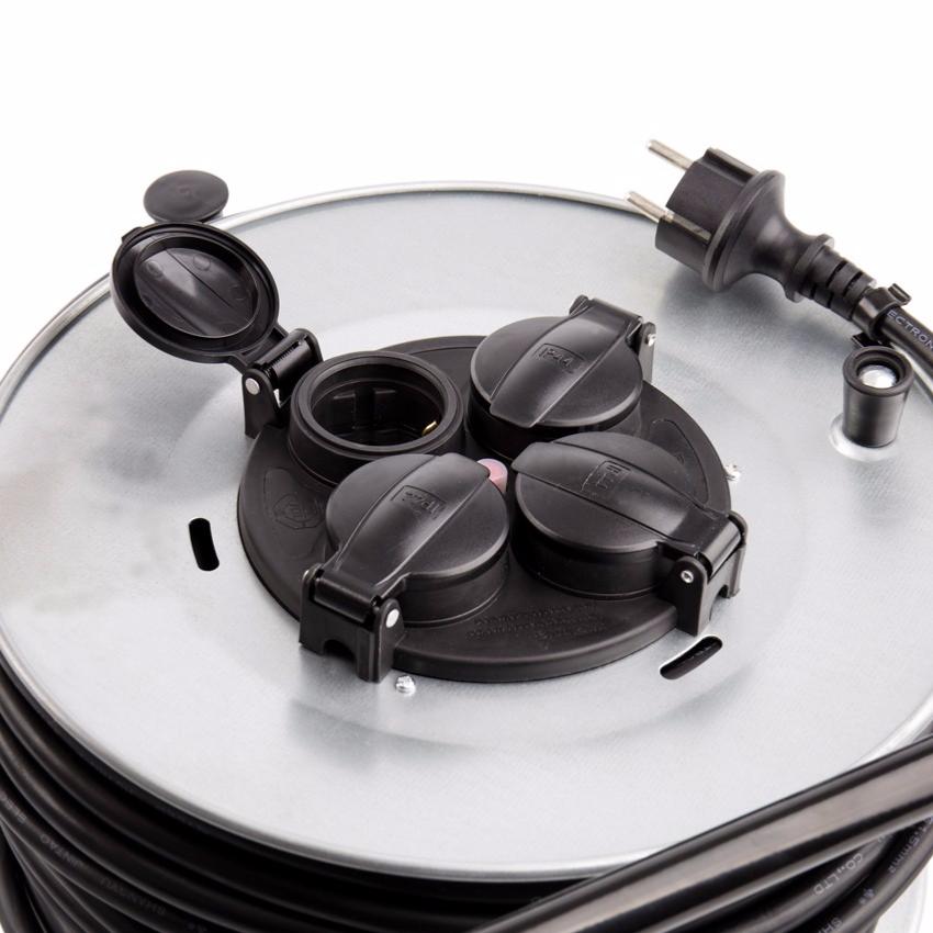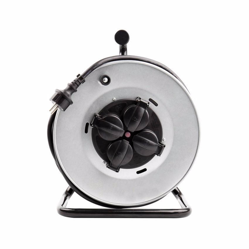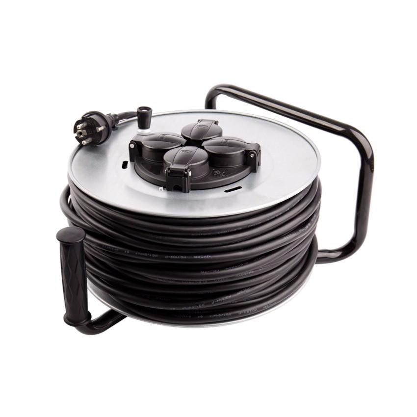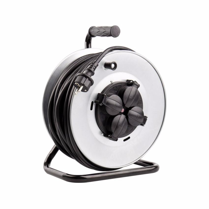 L'Enrouleur Extensible a un câble de haute qualité H07RN-F de 50 mètres (section 3x1.5mm2) et 4 prises IP44 Socket (Allemand).